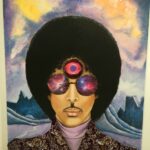 “Prince” by Marcella Muhammad (Oil and Fabric) “‘A strong spirit transcends rules.’ This is a quote from Prince, and this is the inspriation for this painting. Here, Prince has trascended to a new reality on a purple planet where he can view all the wonders of the galazy. The Third Eye Scakra provides the energy for his spitirual refletion and insight. It allows him to experience clear thought and vision. I have used oil, facric and texture on canvas to create this unusual rendition of The Artist Formally Known As Prince.”