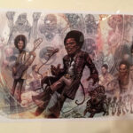 “James Brown” by Dan Lish (Ink and Digital, NFS) “Sometimes I have a specific song in mind when creatig these illustrations. With James Brown (#2) I had ‘Give it up or turn it loose.’ Although many of the artists featured are still living, I merged the music with another Afterlife theme. I imagined JB having a party with his spiritual ancestors, the guardians of his Afican heritage/lineage. I like to exposure the ‘the thinning of vials’ from one plane of existence to another. So soul essence, nature spirits, Faeiries, Mother Nature, Source, the Universe all have a large theme in these works, including this James Browwn piece. I wanted to include past members I really vibed with, including drummers – Jabo Starks, Clyde Stubberfield, Bobby Bird, Hank Ballard and Bootsy Collins.”