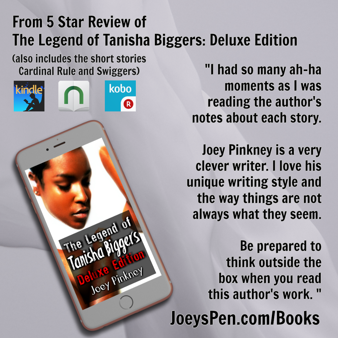 The Legend of Tanisha Biggers is available as a stand-alone novelette or as a Deluxe Edition anthology (which includes the previously published short stories Cardinal Rule and Swiggers). For more information: http:JoeysPen.com/Books.